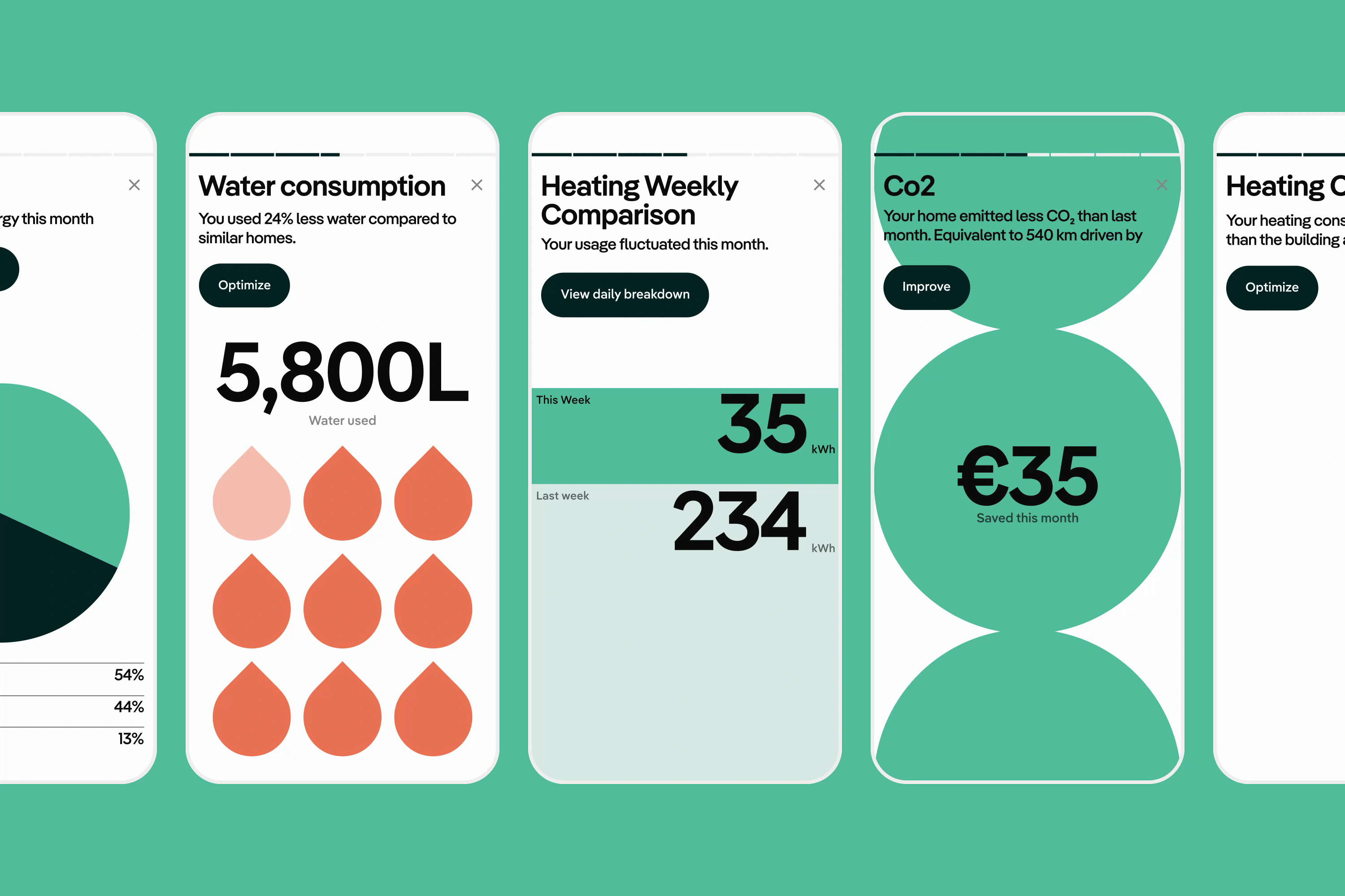 In four weeks, we shaped a bold, Swiss-inspired visual direction for GROPYUS Building OS, the tenant-facing control center for connected apartments, while the product was still evolving. Alongside the new look and feel, we addressed key usability gaps and established a scalable design system foundation. The existing experience struggled in real use. Device controls relied on hidden actions like press-and-hold, and blind controls used complex gestures that looked refined but were difficult to understand quickly. Sustainability content was also generic, with little direction on what residents could actually do to improve their impact. We aligned closely with product, research, and engineering to move fast without losing coherence. The system is anchored by a reusable card component that flexes across the app to organize content and actions consistently, making controls clearer today and ready for future modules like consumption history, sustainability insights, and internet booking.